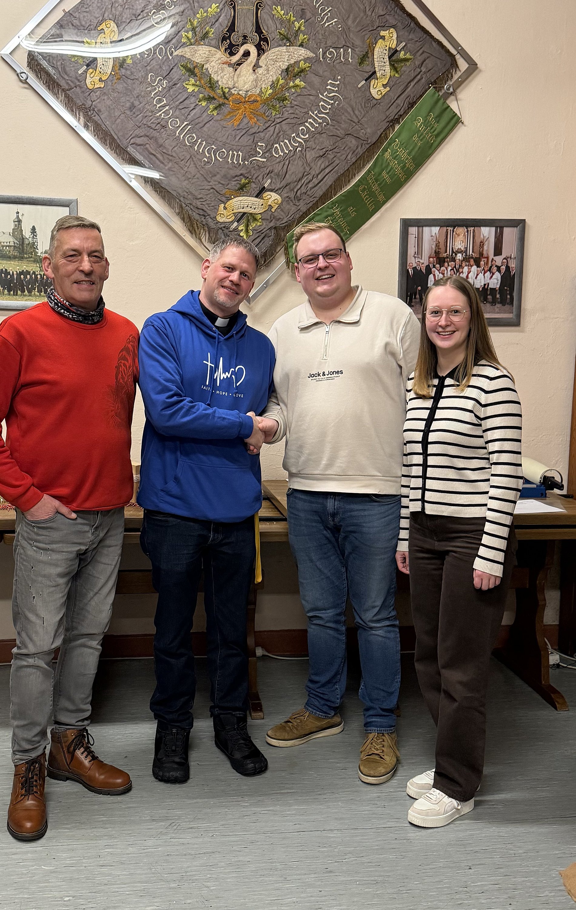 Es gibt Grund zu feiern beim Kirchenchor Cäcilia Langenhahn: Unser Vorstand ist wieder komplett. Wir ernennen Kaplan Matthias Thiel voller Freude zu unserem neuen Präses! Er tritt in die großen Fußstapfen von Pfarrer Ralf Hufsky, der dieses Amt seit 2009 mit großer Treue geführt hat. Wir danken Herrn Pfarrer Hufsky herzlich für 17 Jahre Verbundenheit und dafür, dass er selbst den Anstoß gab, Matthias Thiel ins Boot zu holen und ihm so die Möglichkeit zu geben, weitere wichtige Erfahrungen auf seinem Weg zum Pfarrer zu gewinnen.